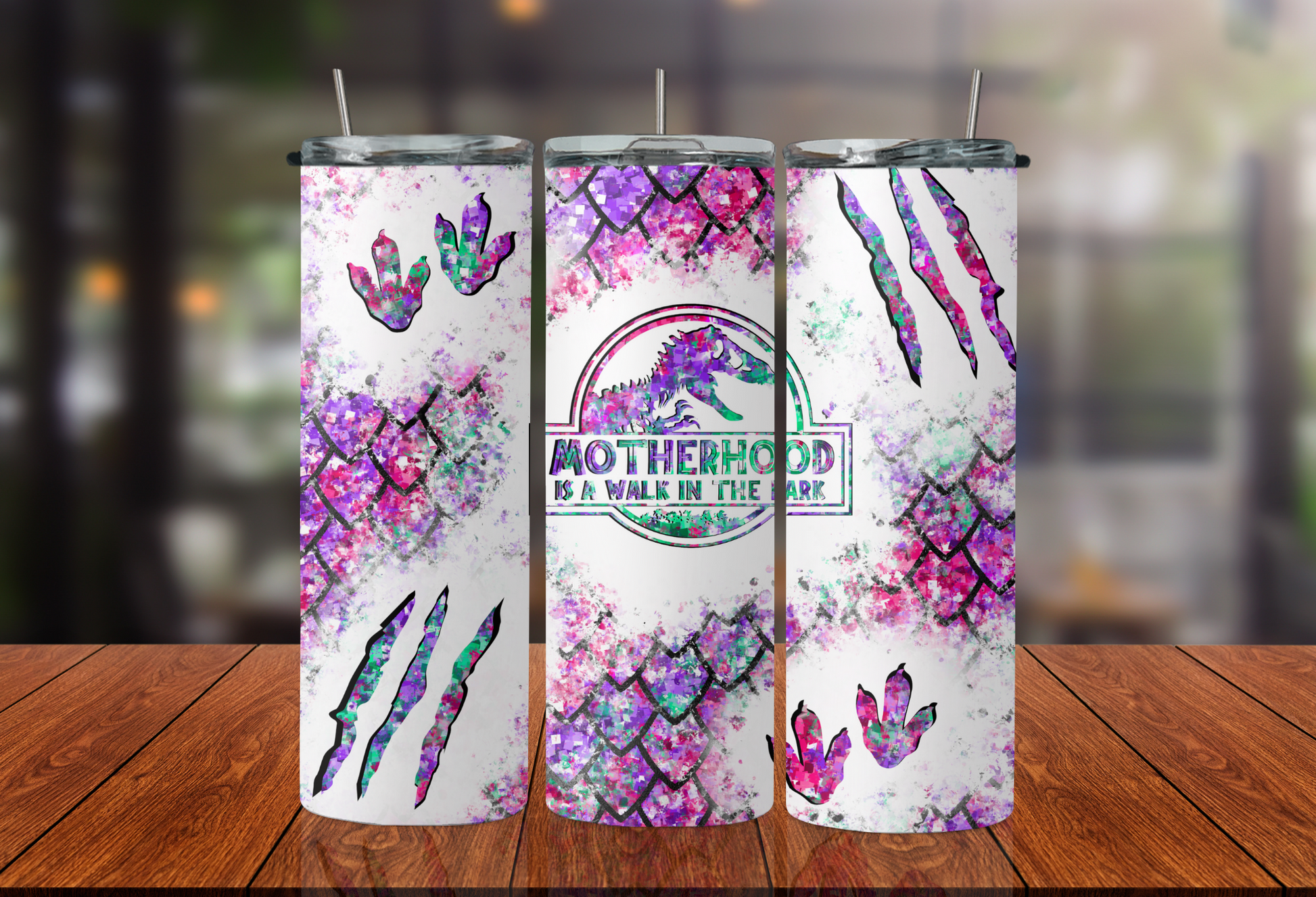 Add some prehistoric fun to your daily routine with our "Motherhood Is A Walk in the Park" tumbler, featuring a playful twist on the iconic Jurassic Park logo in shades of pink and purple. This 20oz insulated tumbler is perfect for moms who handle life with the strength of a T-Rex and the grace of a Velociraptor. Stay hydrated with a touch of Jurassic charm!