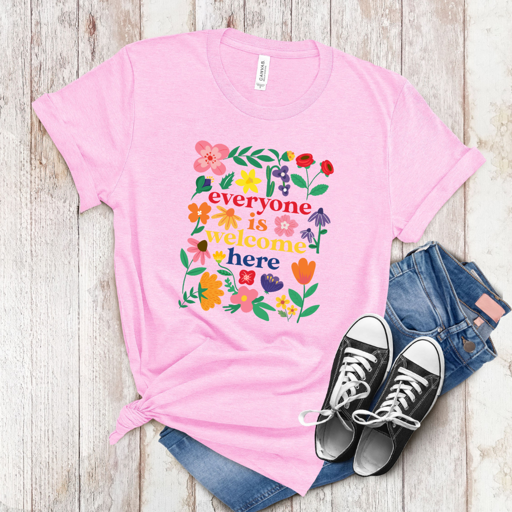 Celebrate diversity and inclusion with our 'Everyone is Welcome Here' T-shirts. Featuring colorful designs with uplifting messages of unity, love, and kindness—perfect for spreading positivity. Available in multiple colors and styles for all ages.
