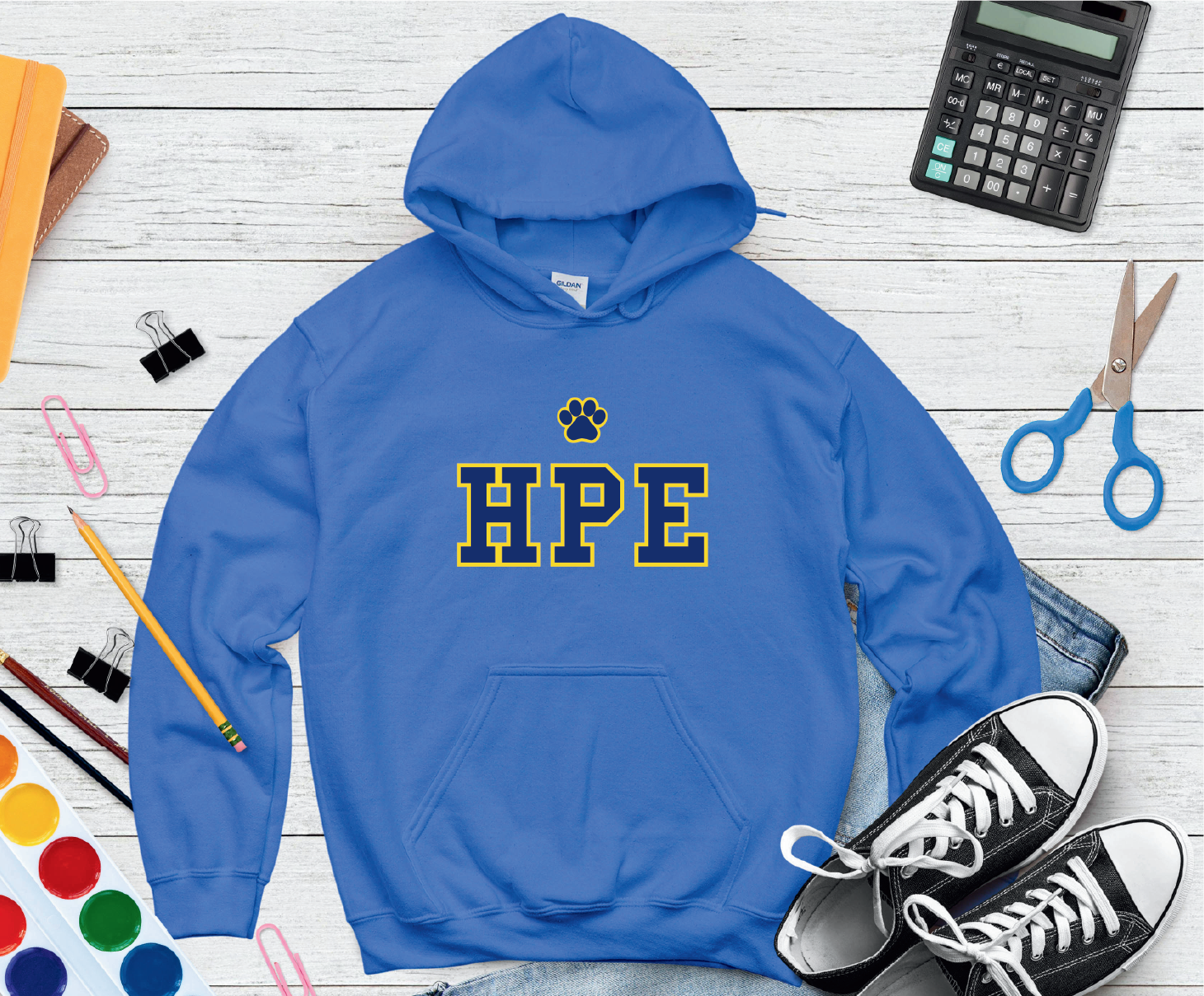 Show your school spirit with the Highland Park Elementary "HPE" Spirit Hoodie! Featuring bold collegiate-style lettering and a paw print logo, this hoodie is perfect for students, teachers, and families to represent HPE with pride. Crafted from soft, durable fabric, this hoodie is designed for all-day comfort, whether you're in class, at a school event, or just staying cozy at home. Available in multiple sizes, this spirit wear is a must-have for the HPE community.
