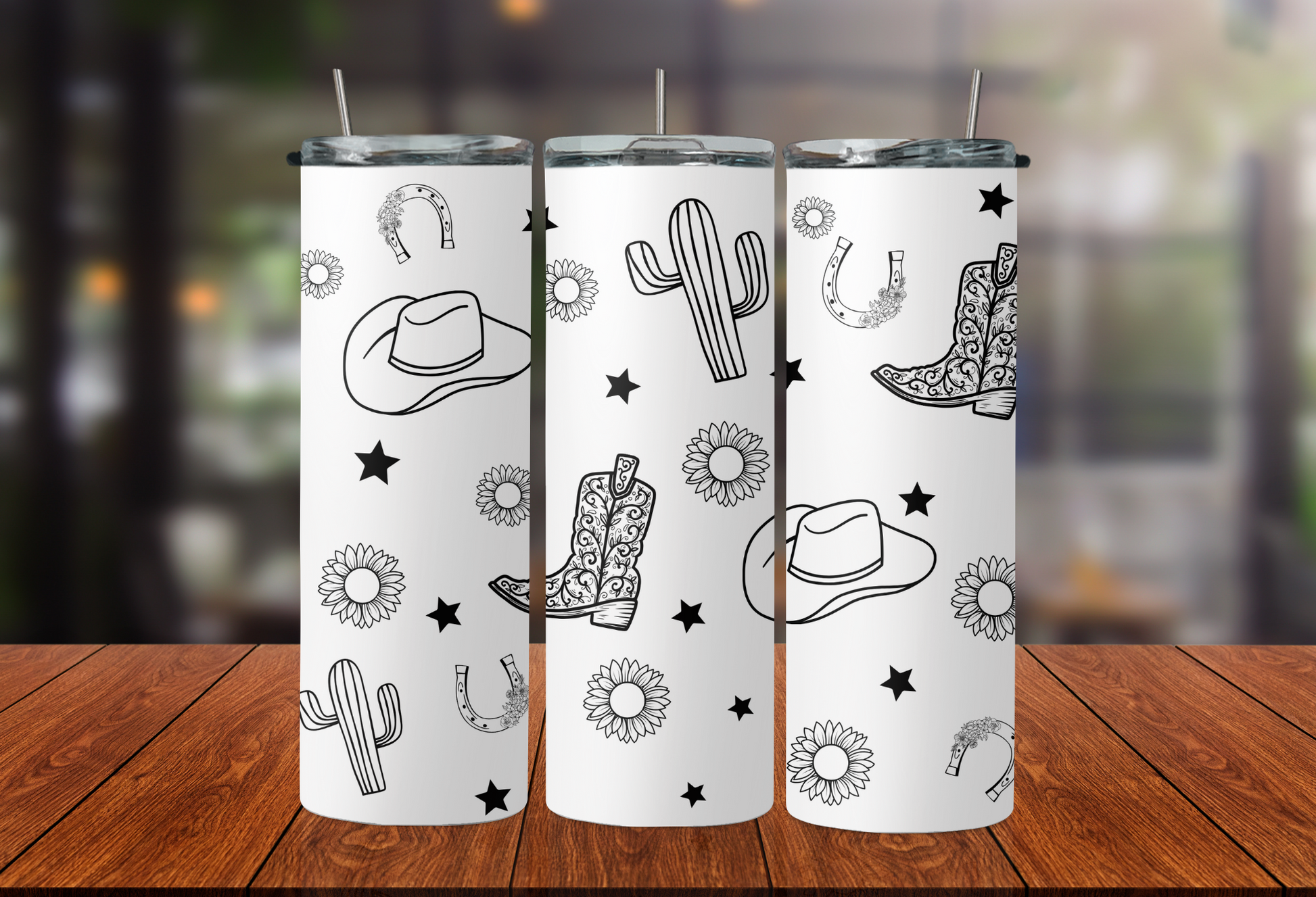 Indulge in your coffee passion with a touch of cowboy charm using our "Frontier Brew" tumbler. This 20oz insulated vessel, festooned with classic Western motifs of boots, hats, and cacti, ensures your coffee stays steaming hot or refreshingly cold. Perfect for urban wranglers and countryside ropers alike. Enjoy your java with a side of wild west zest!