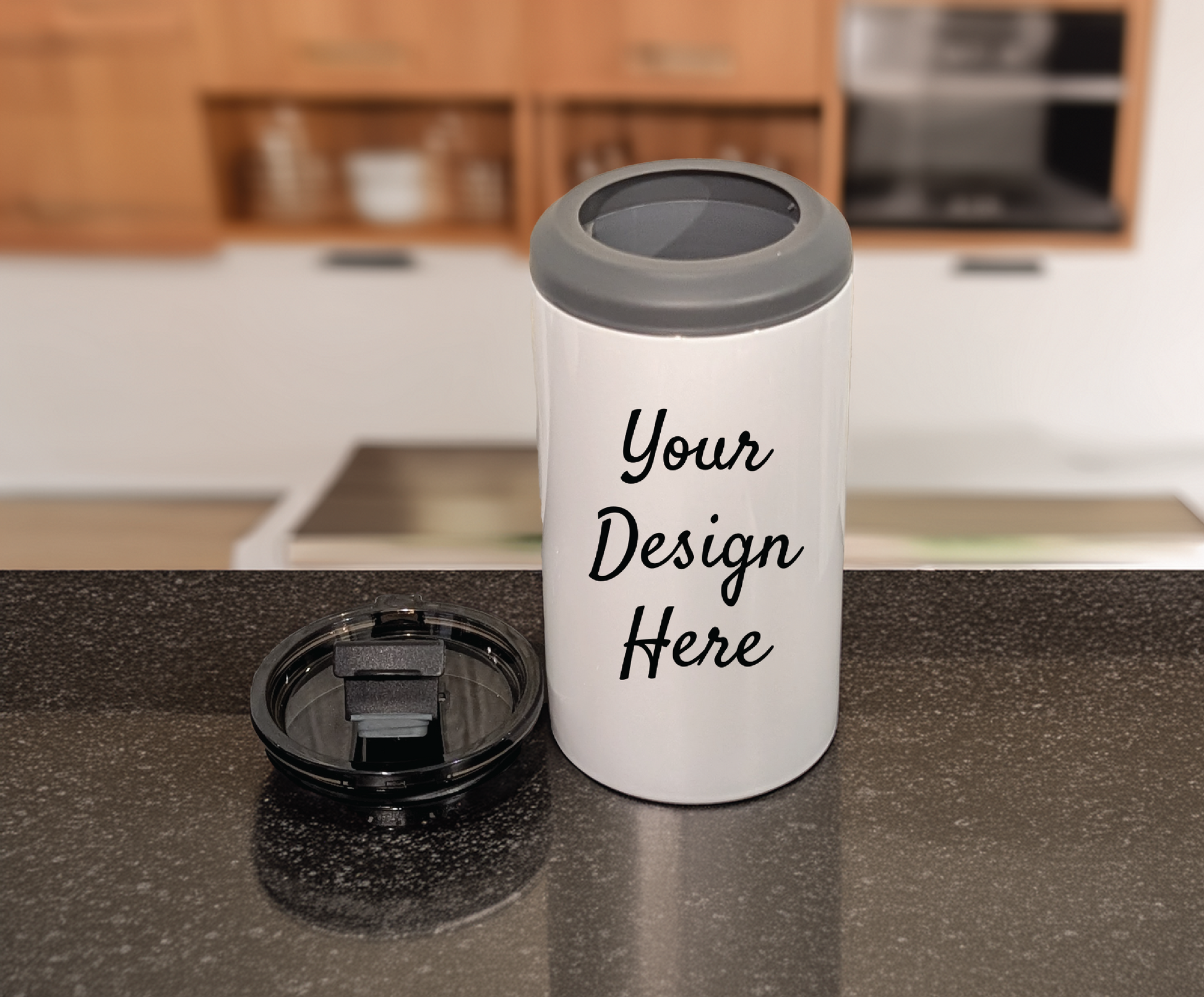 Upgrade your drinkware with this versatile 12oz 4-in-1 Custom Koozie & Tumbler, perfect for both personal use and gifting. This can cooler fits 12oz slim cans, standard cans, and bottles, and doubles as a drinking tumbler with the included lid.