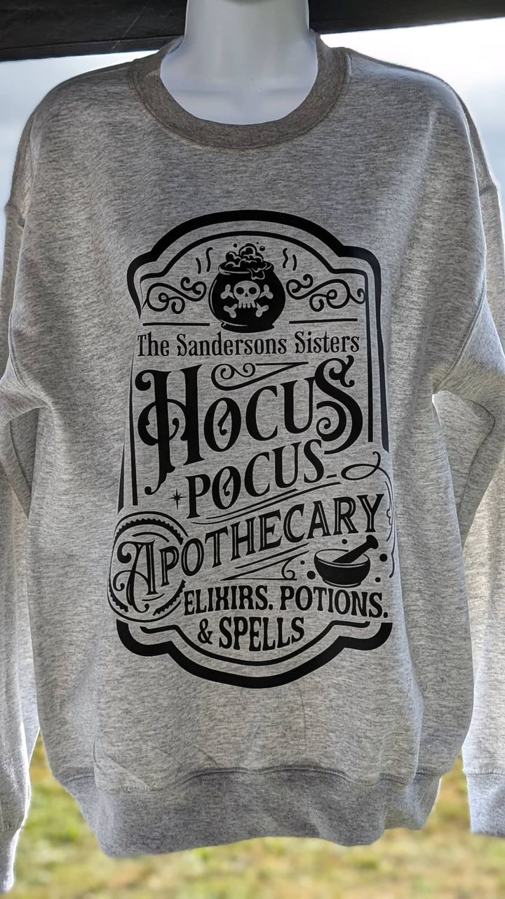 Unleash the magic of the Sanderson Sisters with this enchanting "Hocus Pocus Apothecary" crew neck sweater! Featuring a charming vintage-style design, this sweater showcases the whimsical essence of the witches' apothecary, offering elixirs, potions, and spells. Perfect for fans of the cult classic movie, "Hocus Pocus," this soft and cozy sweater is a must-have for spooky season or year-round magic. Whether you're brewing up potions or enjoying a cozy night in, this sweater will keep you warm and stylish.